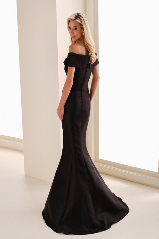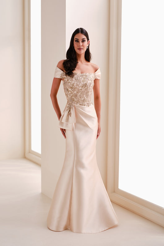 Graceful and sophisticated, this Mikado mermaid gown highlights lace applique beading and stone accents on the bodice with a straight neckline and off-the-shoulder sleeves. A timeless style for special occasions.