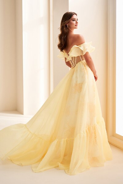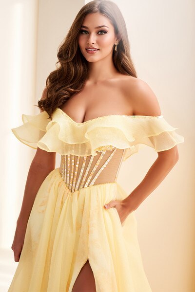 Detachable Off-the-Shoulder Ruffle Collar, Features Pockets, Lace-Up Back, Slit